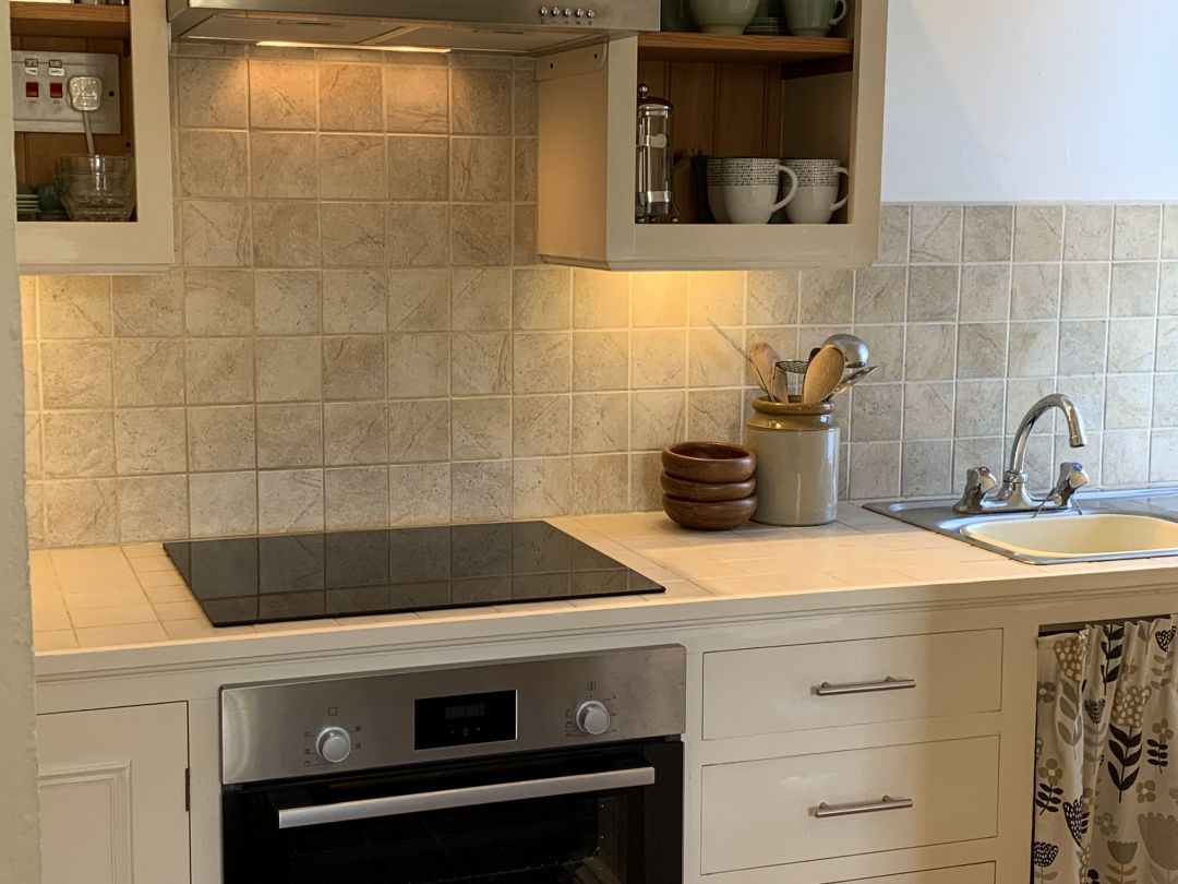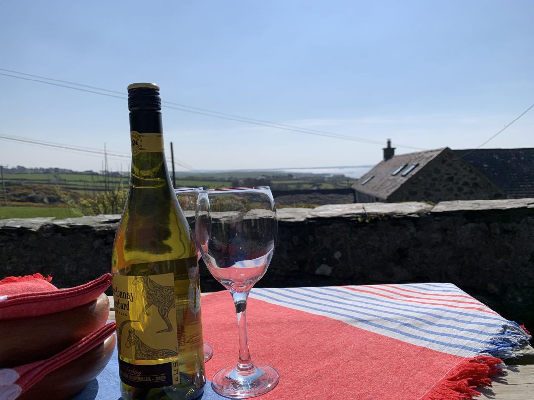 The enclosed lawned garden faces east and catches the sun throughout mornings and afternoons. A paved area at the front holds a picnic table with sun umbrella for outdoor meals, and there’s a portable barbecue plus fold-up chairs in the sunny little porch. The garden is perfect for just sitting with a book and that sea view. There is off-road parking for two cars next to the cottage.