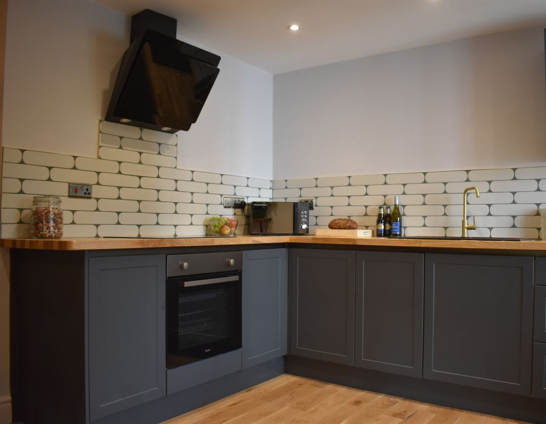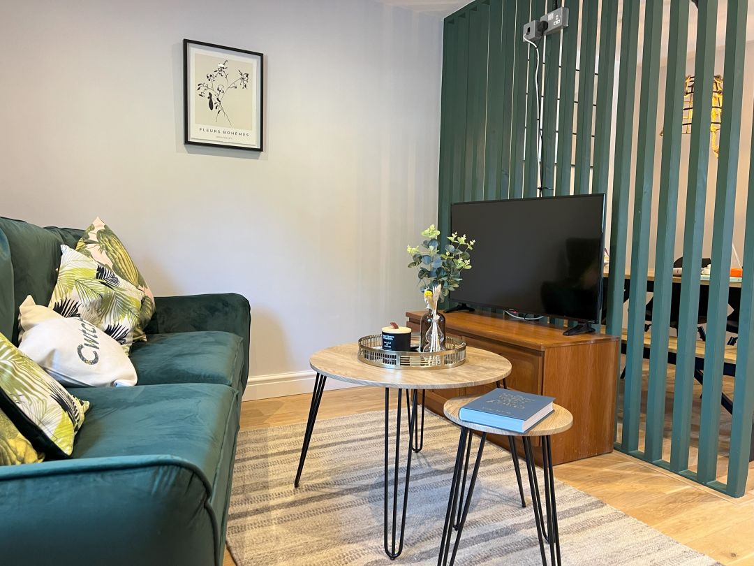 The open plan downstairs feels welcoming and spacious, with natural light coming in through windows at the front and rear. The living area has a luxurious sofa to put your feet up and relax while watching the wall mounted TV. A dividing wall partition gives a cosy feel to the dining area, with a large table to ensure plenty of space to enjoy meals prepared in the modern kitchen, which is fitted with efficient appliances and stocked with utensils, crockery and cutlery to cater and feed up to four hungry people.
