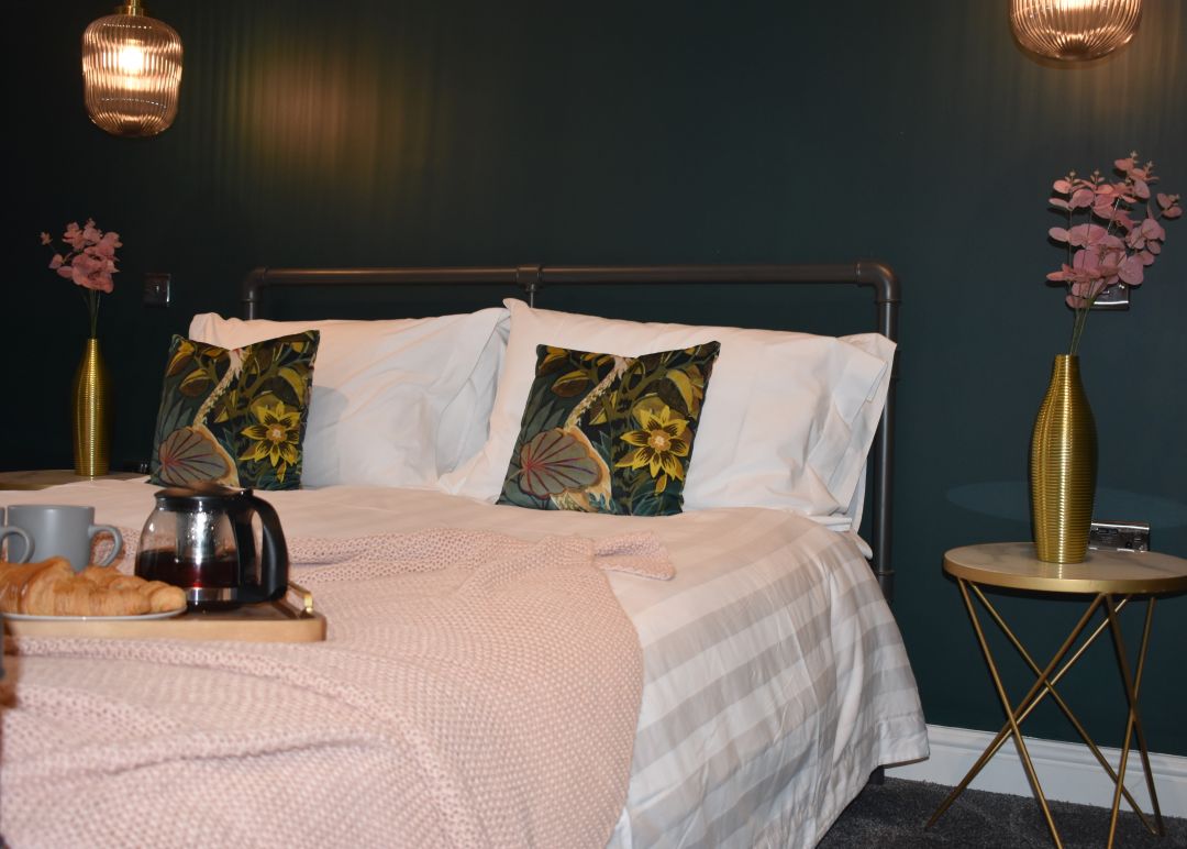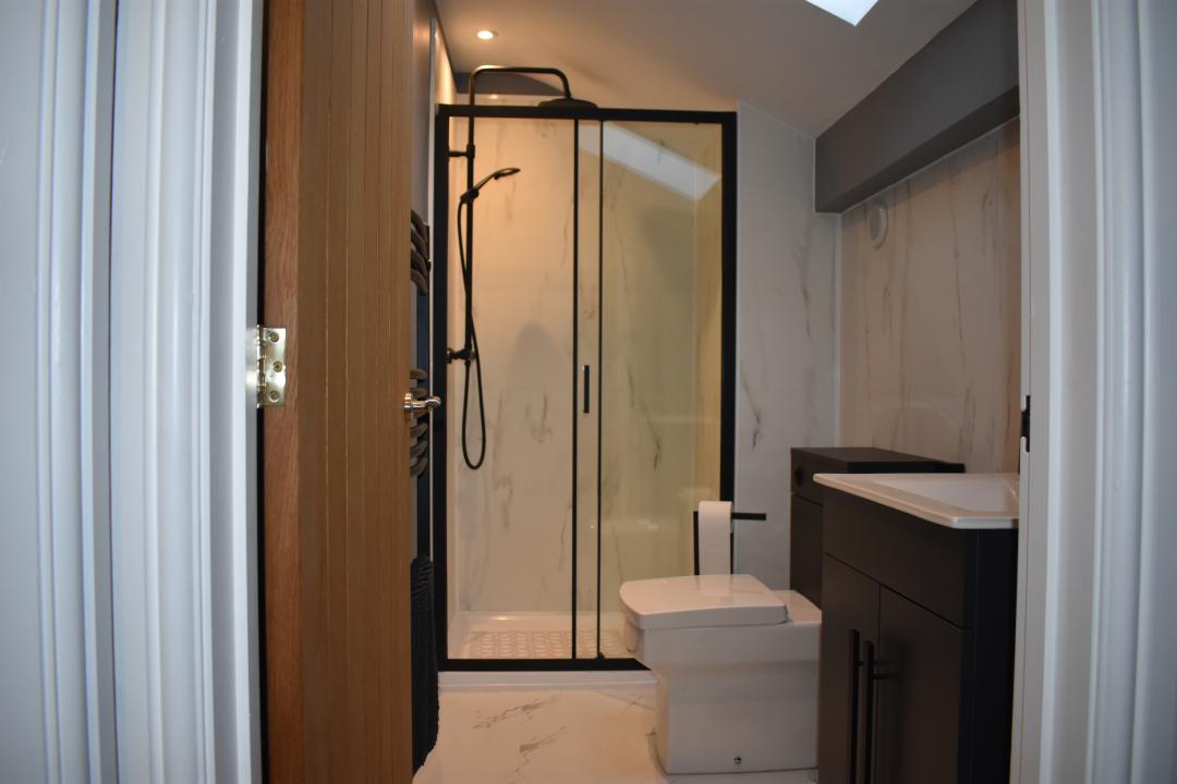 Master bedroom with a gorgeous King bed, bedside tables and reading lights, decorated to give you a luxurious feel and a comfortable sleep.The Twin bedroom has two full-sized (3ft-wide) single beds. The bathroom is modern and bright offering a shower, fitted WC and handbasin. There is off the landing a little 'Cwtch' area offering bean bags - a perfect place for children to chill, read or to utilise social media!