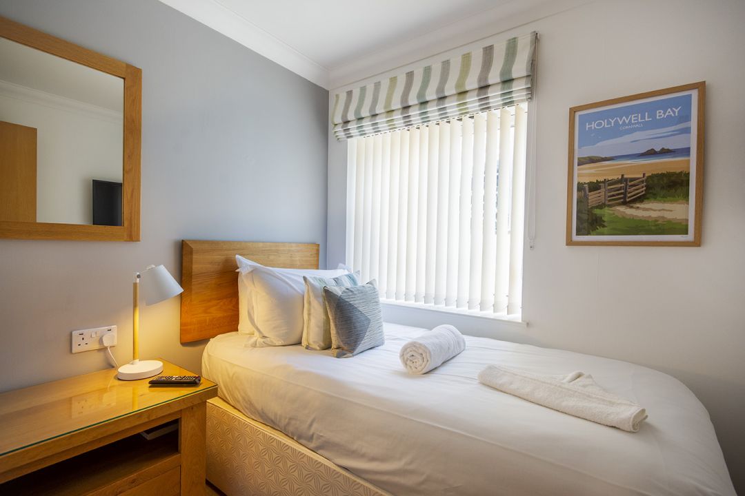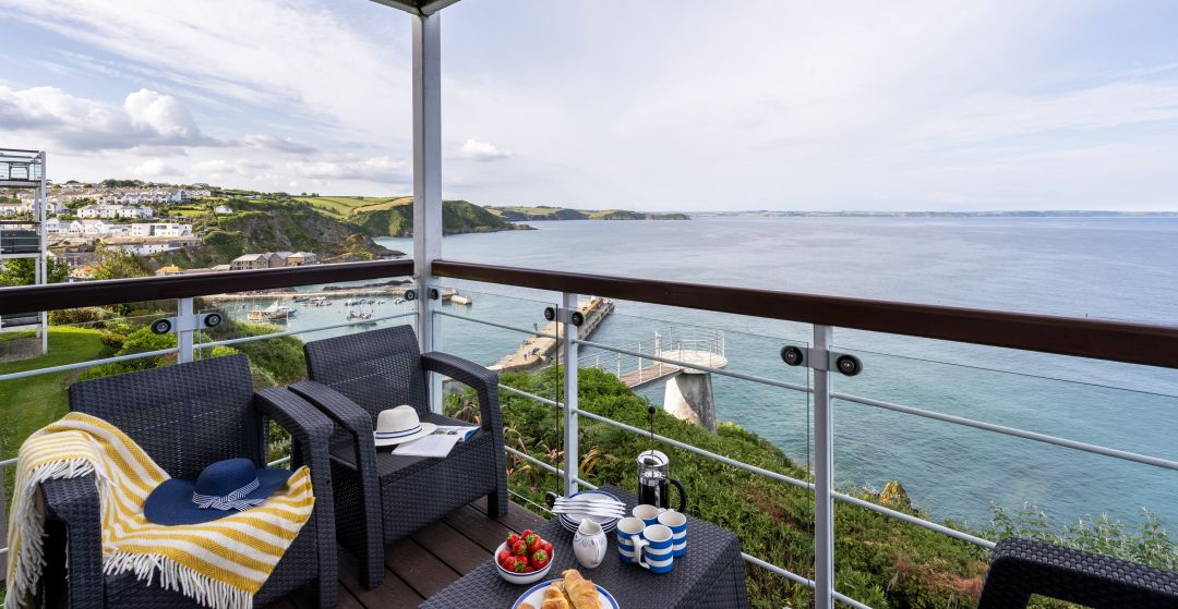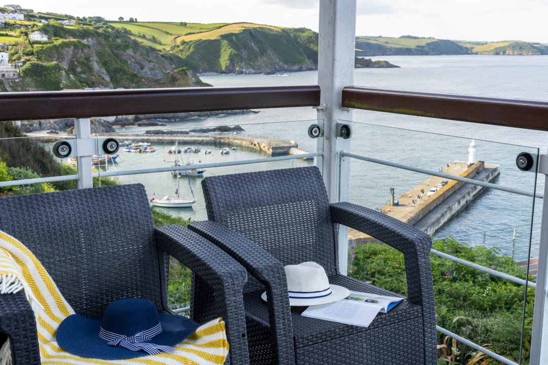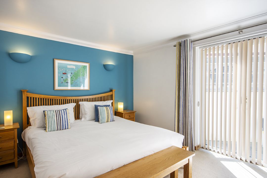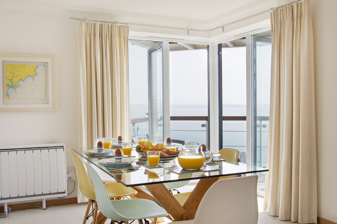 Marine Point is a modern holiday apartment set above Mevagissey, sleeping five people in two bedrooms with a layout that suits families with older children and friends. Wide coastal views stretch across St Austell Bay and shift constantly with the light and the tides. Positioned within the Nare Court development, the holiday home feels calm and well considered, with contemporary interiors that reflect its seaside setting without leaning on nautical clichés. Oak detailing, limestone flooring and carefully chosen artwork give the space a polished but relaxed feel, while large windows draw your attention straight out to the water. The open-plan living, kitchen and dining area is arranged to make the most of the outlook, whether you're sharing meals, reading quietly or simply watching boats move through the bay. Not only is Marine Point wonderfully comfortable, but it's also within a relaxed stroll of cafes, restaurants, and pubs like The Fountain Inn.