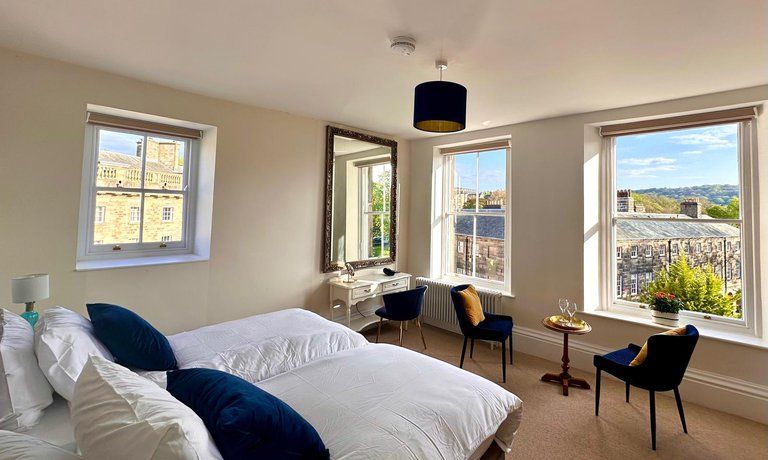 Opera View is a sleek corner apartment in a Grade II-listed building overlooking the oldest part of Buxton. It is on the second floor and does not have an elevator.