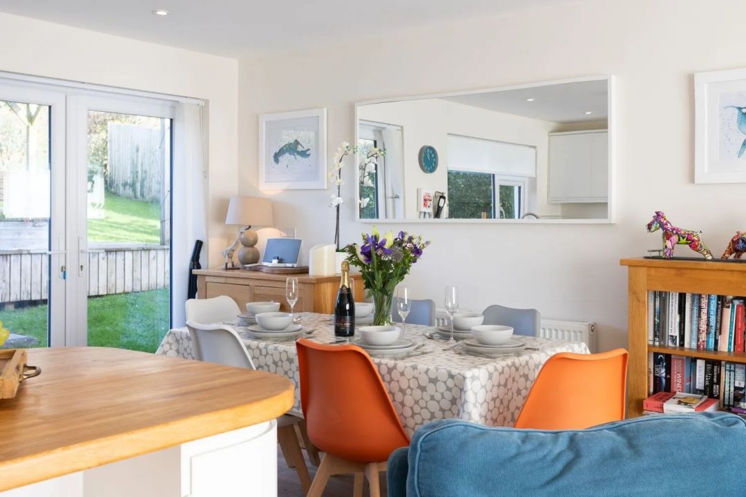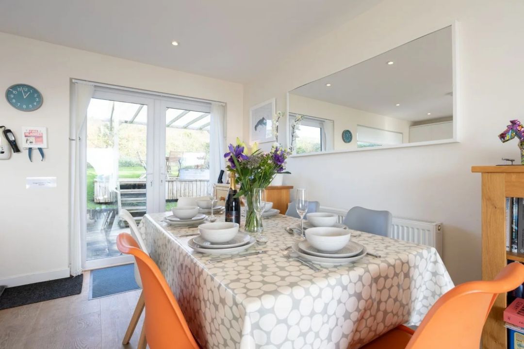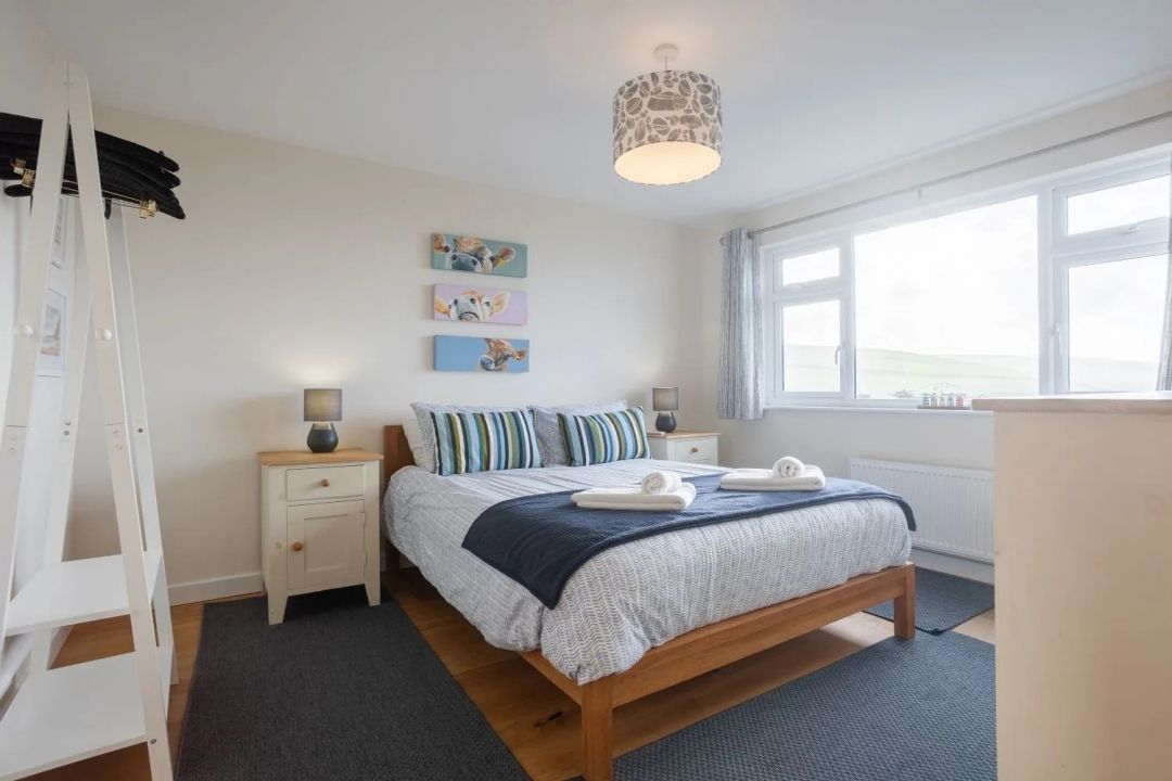 Highfields is a detached bungalow above Woolacombe, looking out across the bay towards the Atlantic. The waterfront holiday home sleeps four in two bedrooms, and everything is on one level, making it easy to settle in straight away. The main living space faces the sea, so the view is always there—whether you're making coffee, reading, or just sitting still for a bit. It's bright for most of the day, then softer towards evening when the light drops behind the headland. The walk down into the village takes about 10 minutes, and The Tides Inn is close enough for an easy dinner without the car.