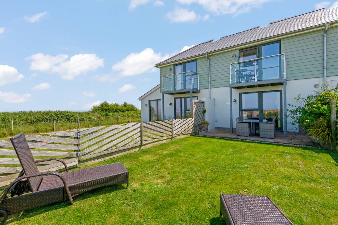 Outside: Nine Ocean Reach has a secure private garden with a level area of lawn and a paved terrace with a table and chairs where guests can sit with a cold drink and watch the sunset over the water. There is allocated off-street parking.