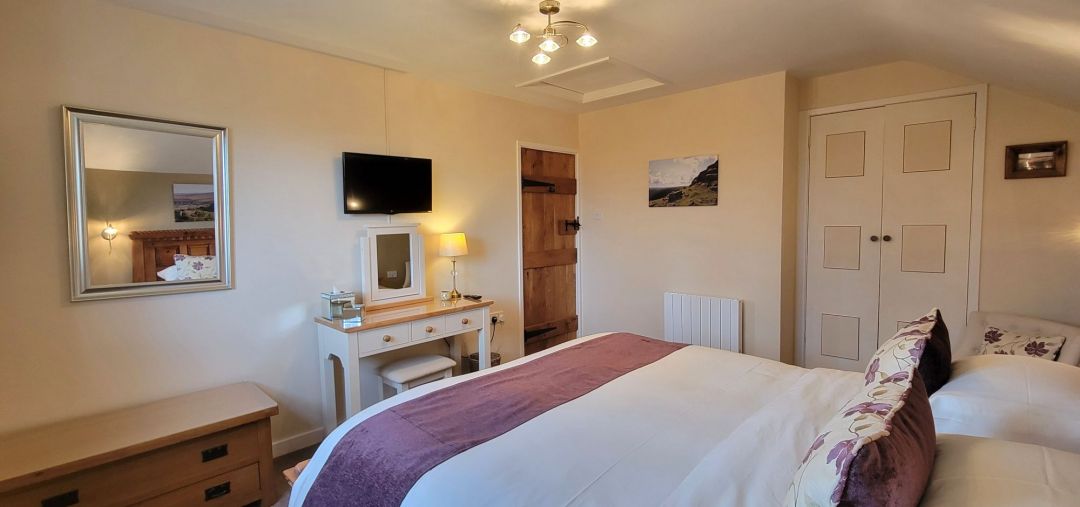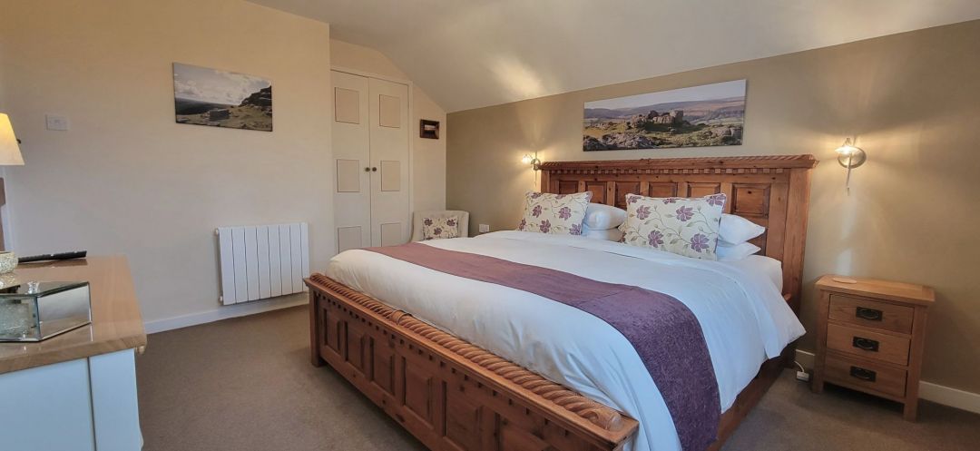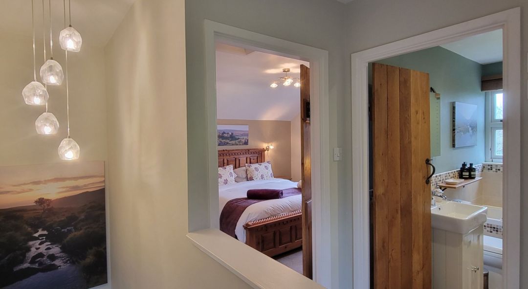 The bedroom has been thoughtfully designed to create a warm and inviting retreat. At its heart is a stunning wooden super king-size bed with a luxurious memory foam mattress, ensuring a restful night’s sleep. Wake up to breathtaking, far-reaching views towards Dartmoor, an ideal spot to watch the sunrise if you're an early riser.