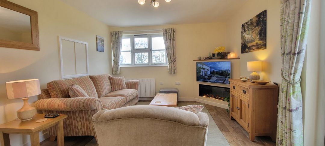 Leading from the kitchen, a spacious sitting room with separate dining area is a light-filled and airy space designed for relaxation. A cozy electric feature fire adds warmth and charm, while a comfortable sofa and chair provides the perfect spot to unwind in the evening. A delightful dining alcove is perfectly situated for taking in views of the garden through the French windows. These open onto a sunny patio, inviting you to step outside and enjoy the fresh countryside air.