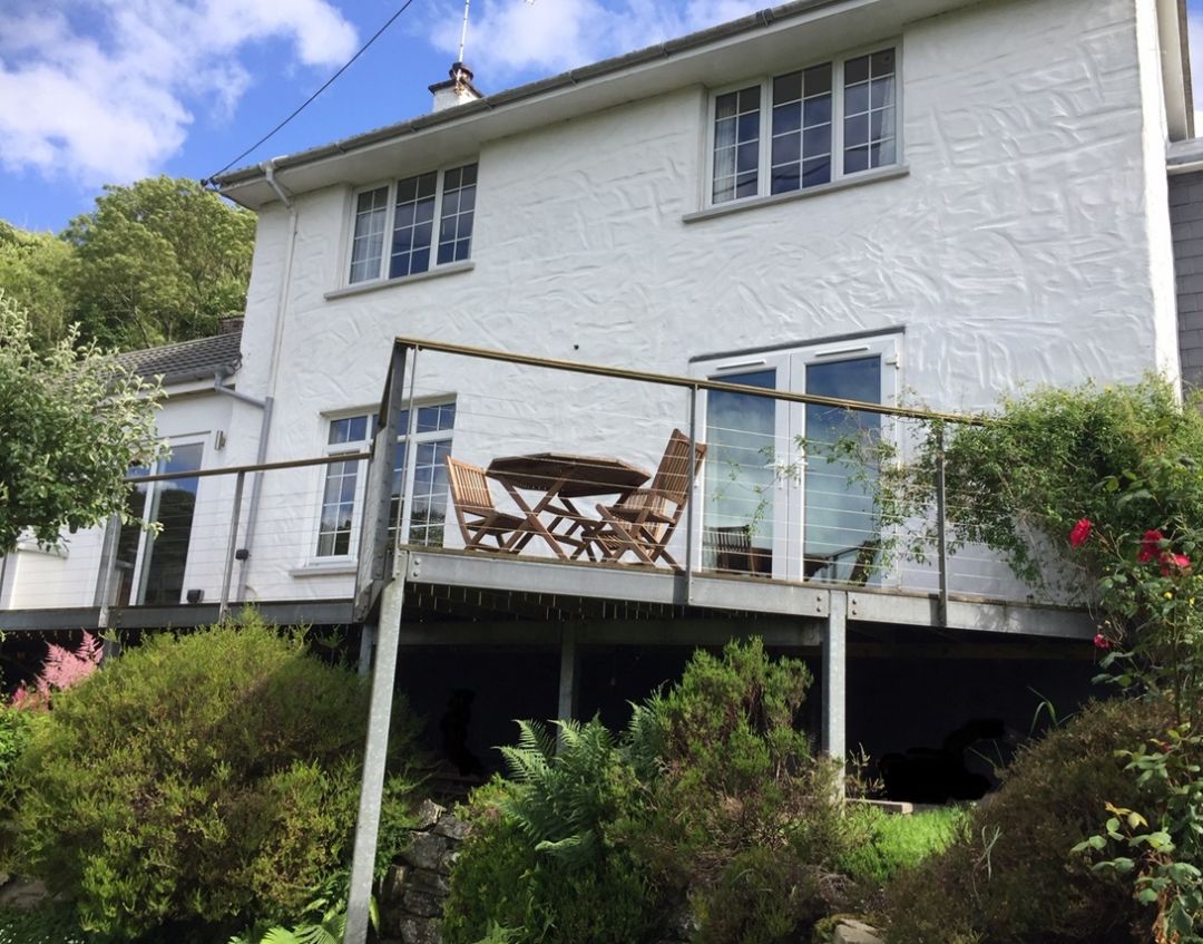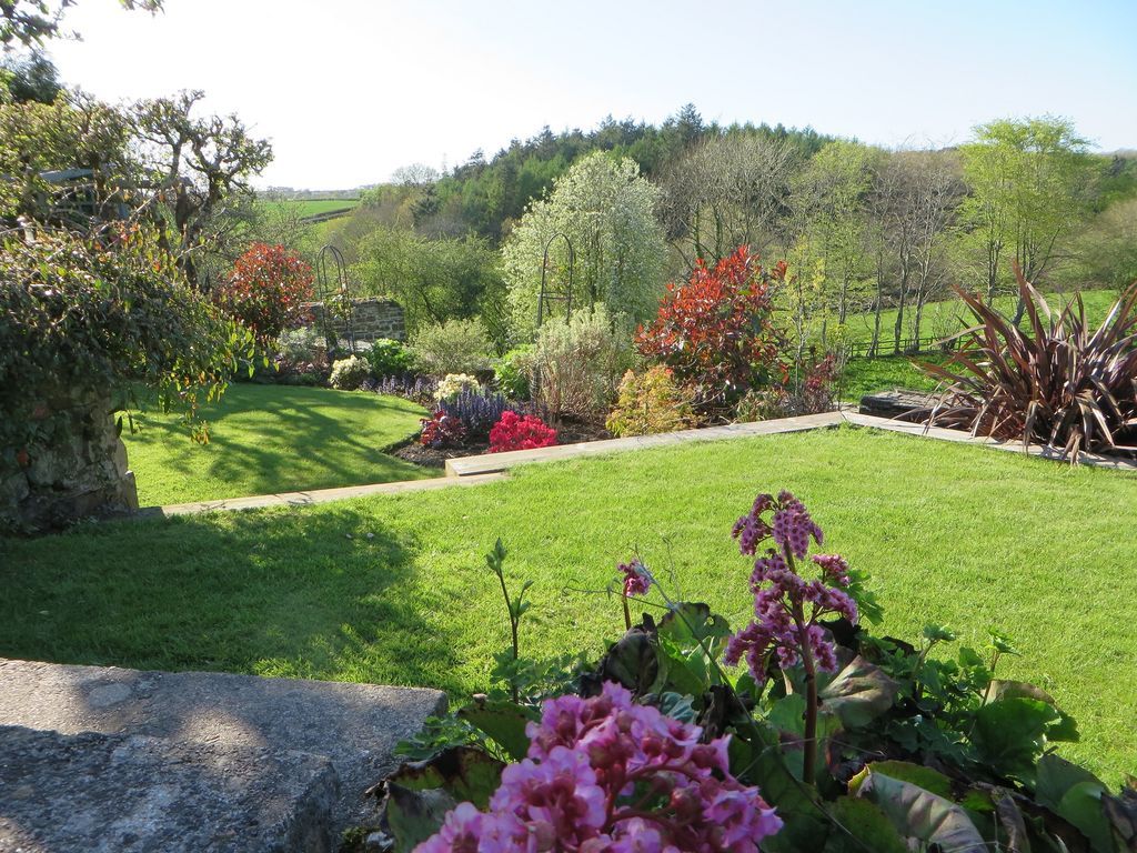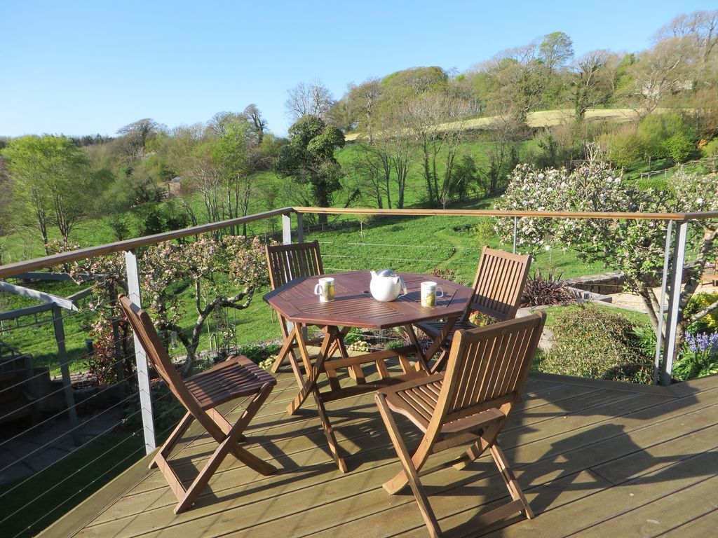 Outside: A spacious wooden deck with garden furniture is accessed via the dining room or outdoor stairs. It is not overlooked by any neighbours and enjoys stunning views of the garden and the fields beyond. The terraced garden is a mix of lawn and mature plants. There is a quiet seating area under a pergola decorated with climbing plants and a sheltered sunken barbecue area for relaxed outdoor meals and to watch the sun go down on a summers evening. There is also private off-street parking for two cars at the front of the cottage.