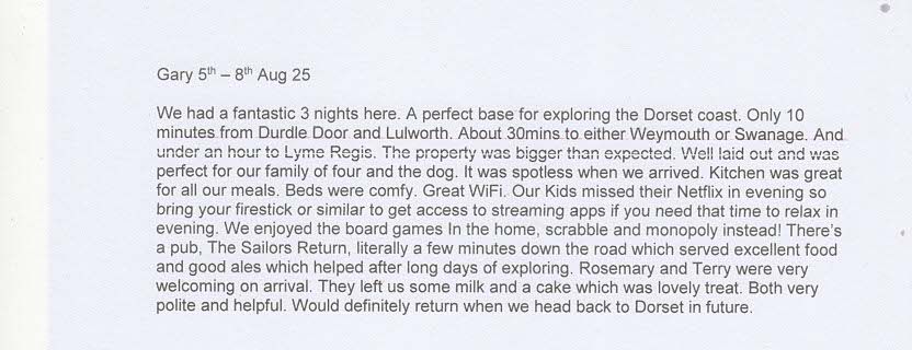 Other days out can feature sightseeing at Corfe Castle, Swanage or the Isle of Purbeck. Visitors can go walking or cycling along trails such as the Jubliee Trail and Lawrence Cycle Ride, or see fun attractions that include Bovington Tank Museum (check their calendar in advance for dates of their tank rides) and Monkey World. While you are out, take a detour past nearby Moreton village to see its gorgeous church and pay your respects at the grave of Lawrence of Arabia, who lived in nearby Clouds Hill.