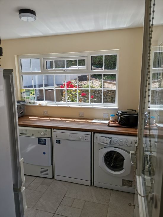 This spacious 4 bedroom cottage comfortably accommodates eight guests + travel cot in four bedrooms. The large secure garden is private and has comfortable patio furnishings, making it perfect for dogs, as well as family barbecues. Enjoy cosy winter evenings relaxing in comfort in front of the wood burning stove and SMART TV in the large lounge/dining room with comfy leather seating and dining table which extends to comfortably seat up to eight guests. Enjoy a sing-a-long around the piano. Fully equipped kitchen and utility with electric cooker, dishwasher, fridge freezer, washing machine and tumble drier.