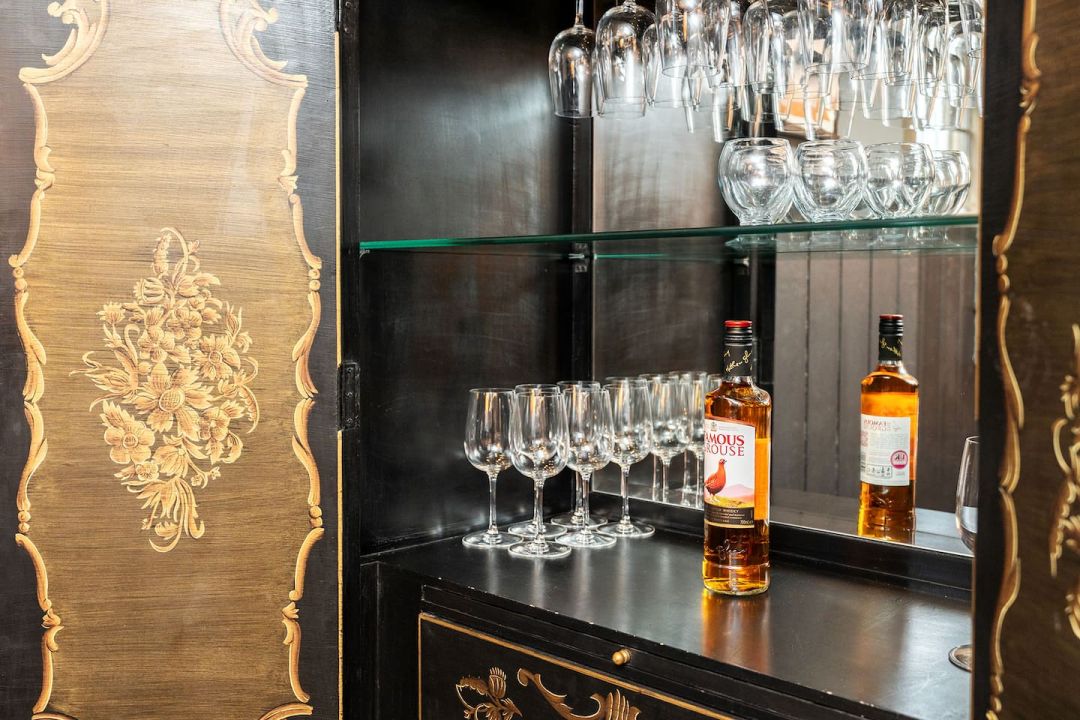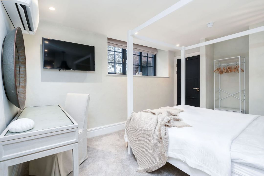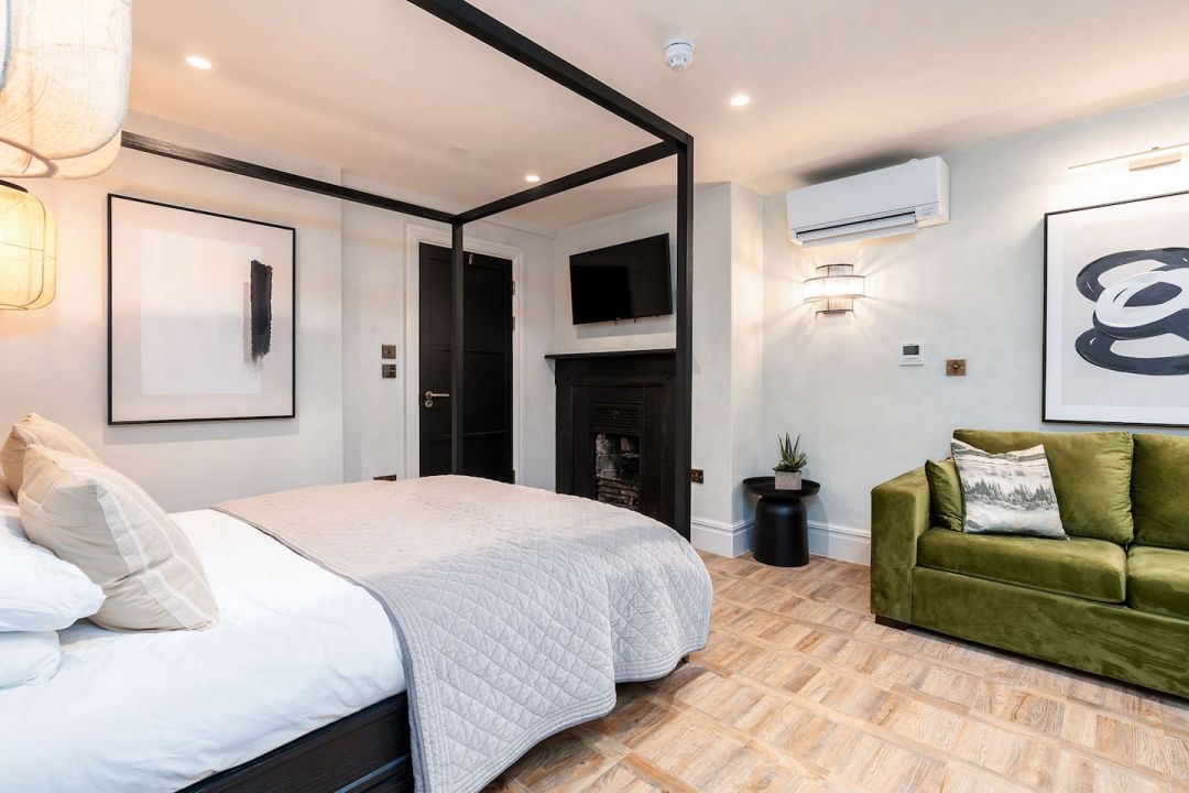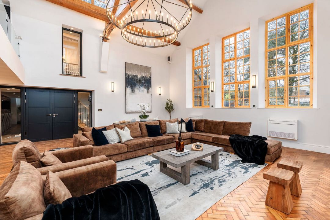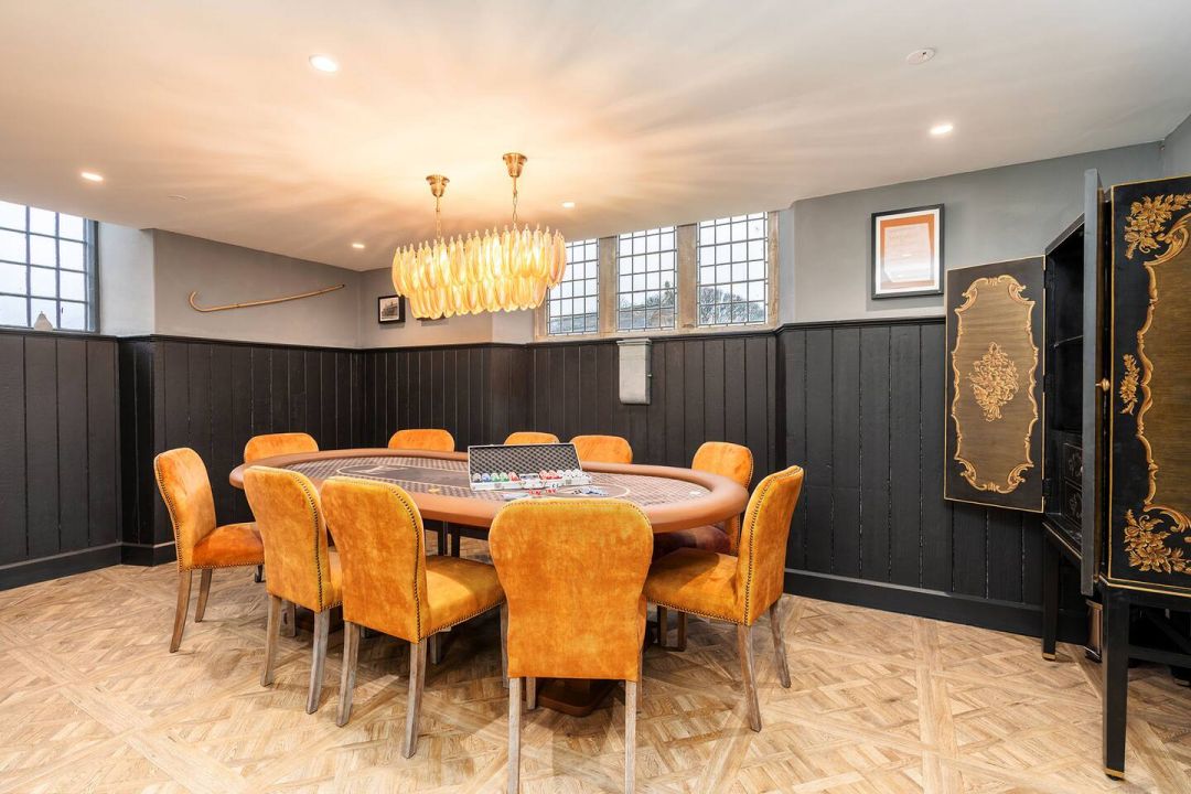The interior has been carefully designed to balance impact with comfort. High ceilings, large original-style windows and a strong sense of scale give the main living areas a light, open feel, while the finishes remain calm and considered rather than showy. Neutral colour palettes, quality furnishings and soft lighting create spaces that feel relaxed despite their size. The main open-plan living and dining area forms the centre of the house, with space for long meals, presentations or evening gatherings, anchored by an authentic fireplace that adds warmth and atmosphere. A high-spec kitchen sits alongside, equipped for catering at scale and practical enough for groups to use together. Elsewhere, the cinema room and casino space offer more immersive experiences, while the mezzanine bar and games areas introduce height, separation and visual interest without breaking the flow of the house. All bedrooms are en suite, air-conditioned, and finished to a consistent standard, with flexible bed layouts to suit different group arrangements. Four bedrooms are located on the ground floor, supporting accessibility and ease of movement throughout the property.