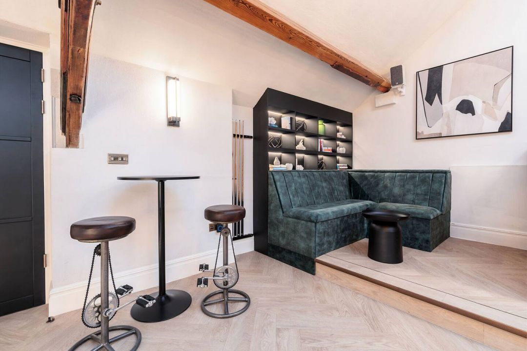 The mezzanine level is a second social hub. Here, a stylish bar area sits alongside a pool table and games, creating a space that feels separate without being disconnected. The cinema room offers a more immersive experience with tiered seating and low lighting for film nights or quiet downtime, while the casino room adds a playful edge to evening entertainment. There is also a rotating mirror disco ball and led lighting for parties covering the lounge and mezzanine area.
