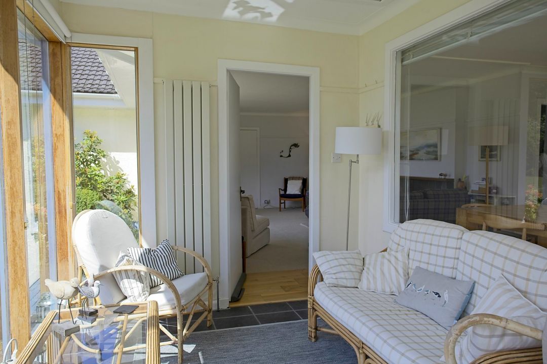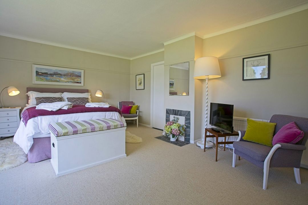 The living room has a picture window overlooking loch and mountains. Open fire (solid fuel for fire not provided, but easily available at local petrol stations). TV, DVD player, DVD library, books and games. Dining table seating 6, high chair and children’s booster seats on request. Comfortably furnished conservatory leading on to decking and outside garden.