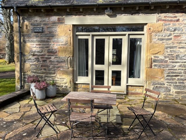Outside: The Coach House has a patio with table and chairs, and off street parking.