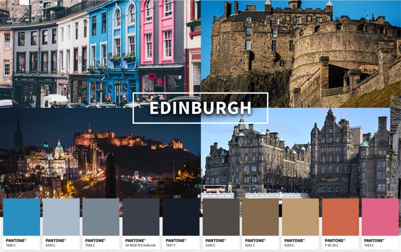 Scotland’s historic capital of Edinburgh is truly a sight to behold. The ancient buildings from the castle and those found along the Royal Mile display rich and light browns of 4243 C and 4254 C. Those who know the gem of a city well will also be familiar with its rows of bright buildings bringing in a rainbow of colours including blue 7689 C to a bright pink in shade 7423 C.