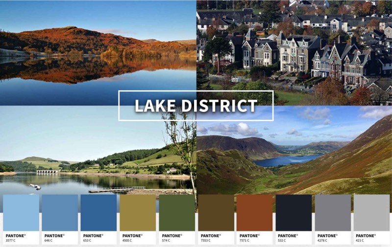 Undoubtedly another of the UK’s most majestic beauty spots is the Lake District. The famed lakes range in shades of blue from a light 3577 C to a richer 646 C and much darker 653 C. The surrounding mountainous landscapes display the brown of Pantone’s 7553 C and 7571 C alongside the dark green of 574 C.