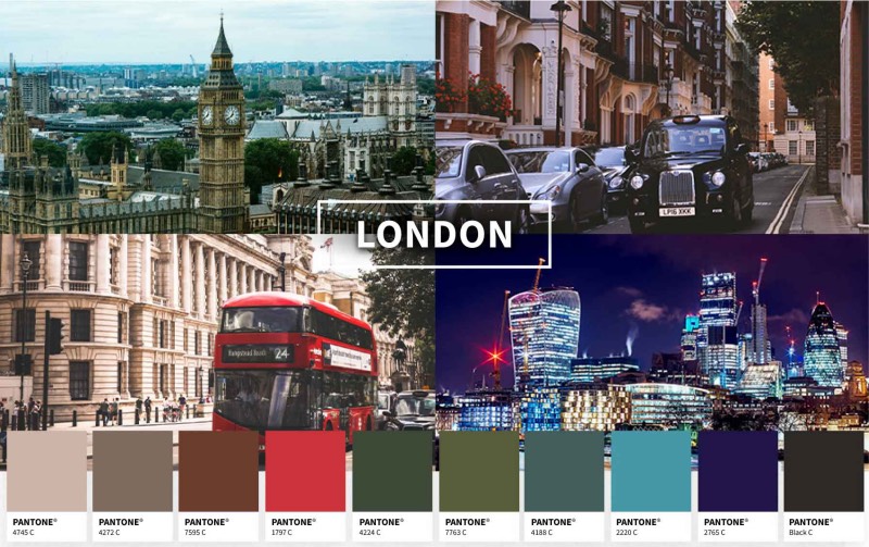 When you think of London the first colours that spring to mind are surely white and red. That iconic red of postboxes, telephone boxes and buses is Pantone 1797 C, while the off-white buildings include shades of Pantone’s 4745 C. At night, the city lights up in colours of pale blue 2220 C, dark blue 2765 C, and Pantone’s Black C.