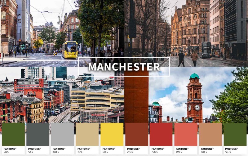 The red brick of Manchester has to be one of the city’s most iconic colours, and it aligns with Pantone’s 2443 C. Meanwhile, the bright yellow tram you will often see zooming through the city is in Pantone 129 C, and other colours you can see coming through the city’s mix of old and modern architecture range from more red-based tones of 7620 C and 2448 C to grey shades of 425 C and 4281 C.