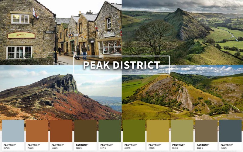 One of the most beautiful countryside spots in all of the UK is the glorious Peak District. The dramatic landscapes and rolling hills display shades of green, brown, yellow and orange. The more orange-tinted brown of the hills displays shades of Pantone’s 1615 C, while greens range from a very dark 547 C to a more yellow-based 4021 C and a pale 5835 C.