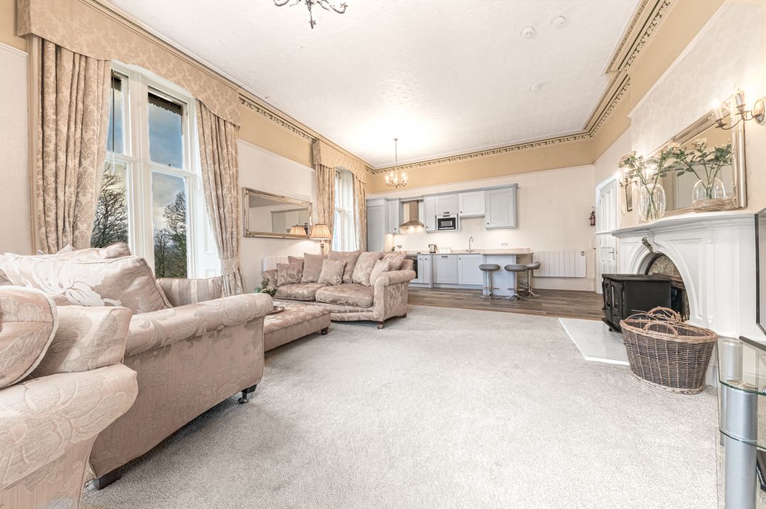 Flowing naturally from the hallway, the impressive and rather sophisticated living space compromises a newly fitted dining kitchen and an open-plan lounge with an array of comfortable seating – be it an evening in front of the SMART TV on the deep cushioned fabric suites, or an afternoon beside the lake view windows, your time at 1 Brathay Fell is sure to be a pleasant one. Adding charm, the wood burning stove is set against a backdrop of full-height windows, ornate cornices and pure grandeur.