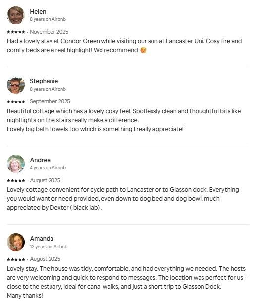 Spring and summer light up Conder Green, and Stork Cottage is one of the area’s most sought‑after stays. Our guests love us, and dates book fast. We offer great last‑minute deals and welcome enquiries for 2026. If you are a single person or a couple please contact us for a discount ( applicable when using just one bedroom) We reply quickly and can often accommodate 2‑night stays when the diary allows. Contact us anytime: 07532 755065.