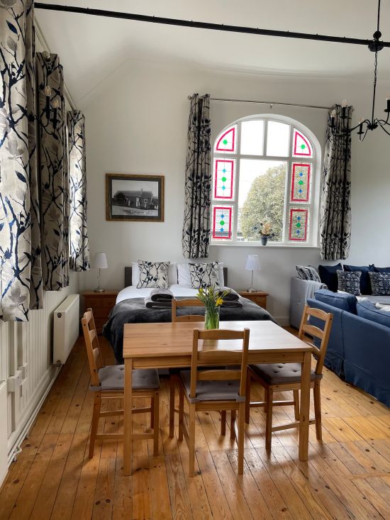The Old Chapel is a large studio cottage with separate areas for cooking, eating, sleeping, and relaxing. It's dog-friendly and has no internal stairs.