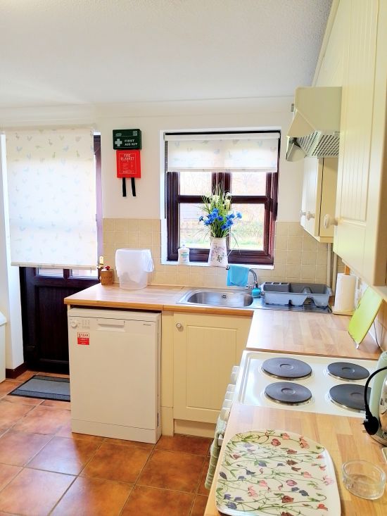 Kitchen Diner - Fully equipped for Self Catering Including - Dishwasher, Electric Cooker, Extractor Fan, Kettle, Toaster, Microwave, Nespresso Coffee Machine. Table and Chairs, Ample Storage, Tall half & half Fridge/Freezer, Ironing Board & Iron and Cleaning Equipment, Door that leads to the enclosed terrace.