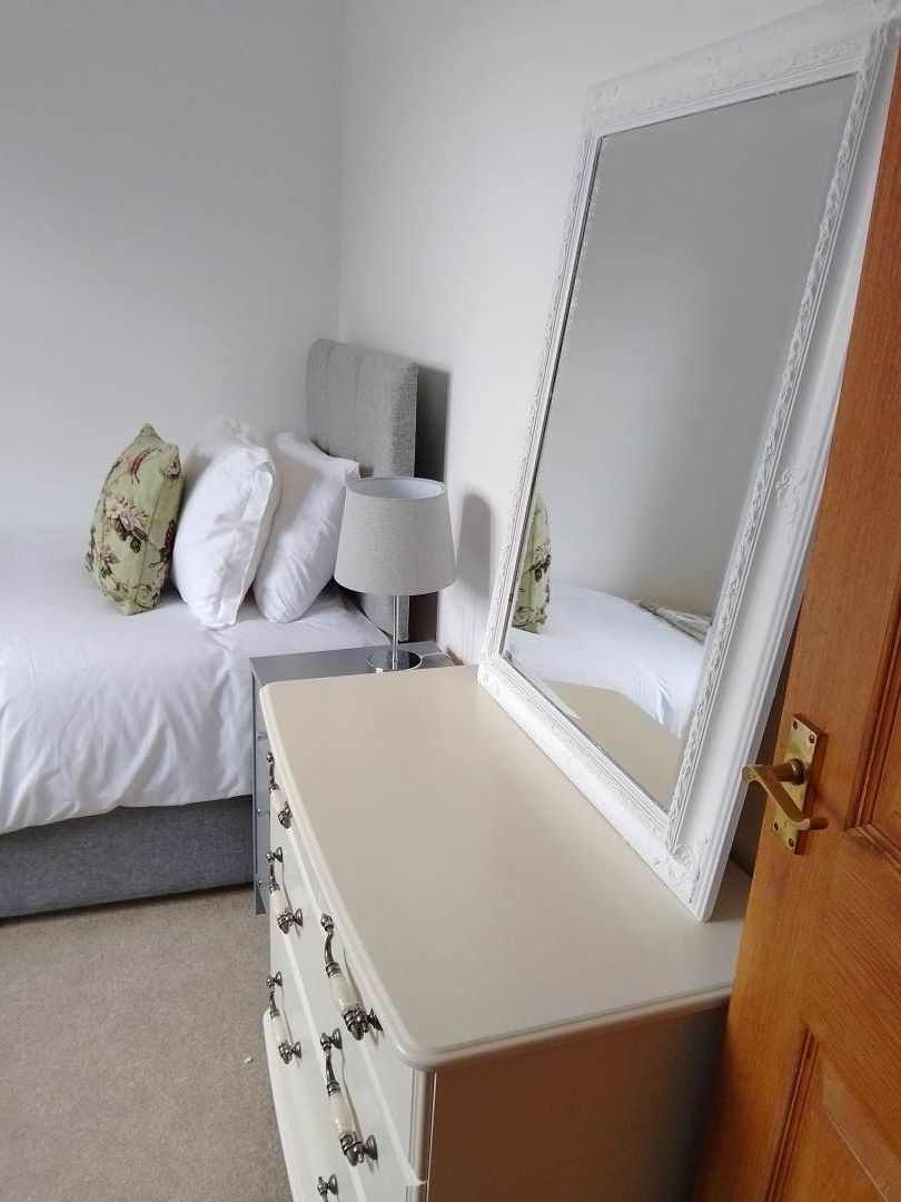 The Single bedroom on the ground floor is ideal for guests with reduced mobility, this pretty room has a wardrobe, drawers, bedside cabinet, hangers, mirrors, lamp, hairdryer and radiator.