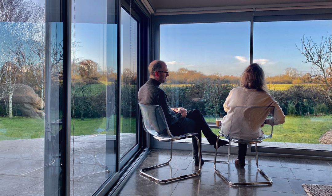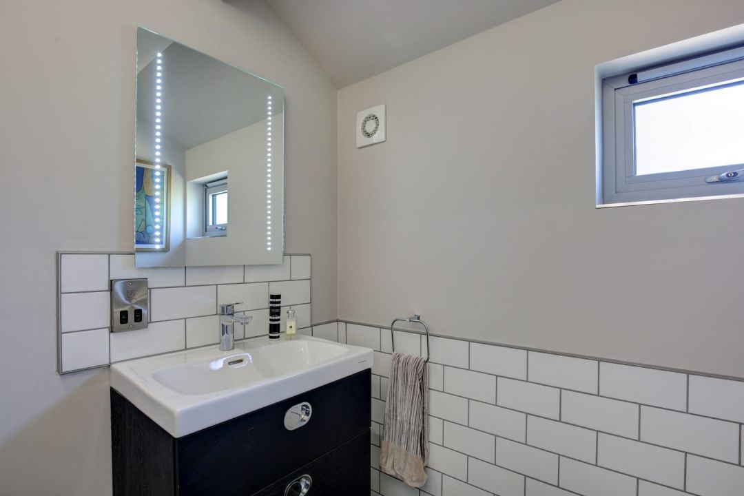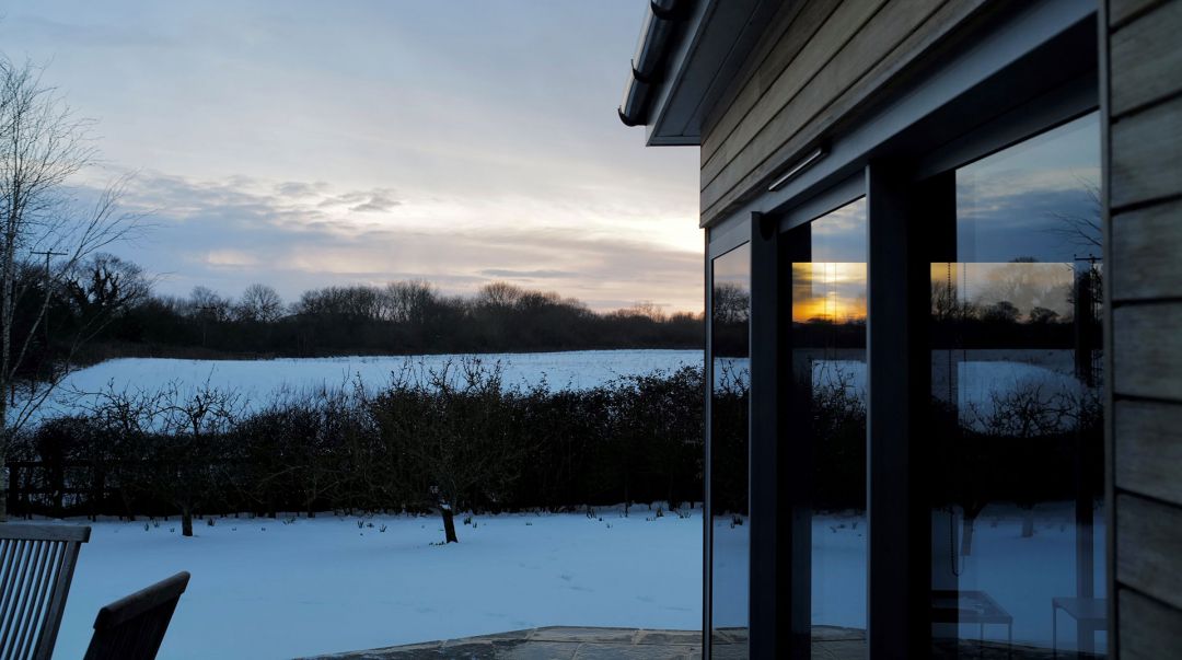 The open plan kitchen, living room is flooded with light, with full height sliding doors opening onto the patio and south facing garden – the endless views are divine. Take a seat and you may spot a neighbourly owl quartering the fields, deer wandering in from the park and, in the winter months, enjoy fuchsia skies full of pink footed geese – just magical.