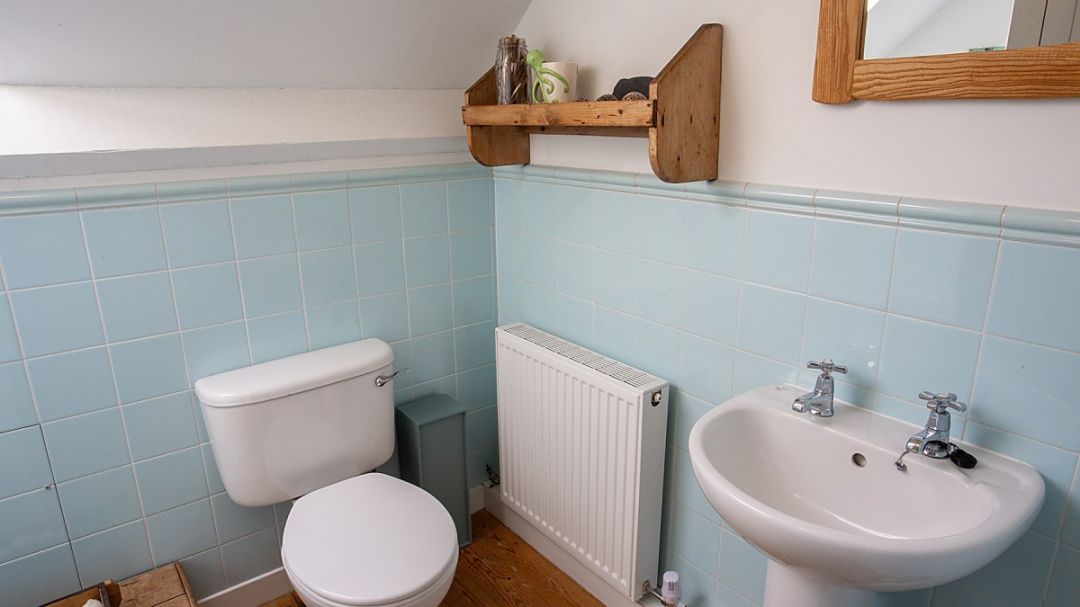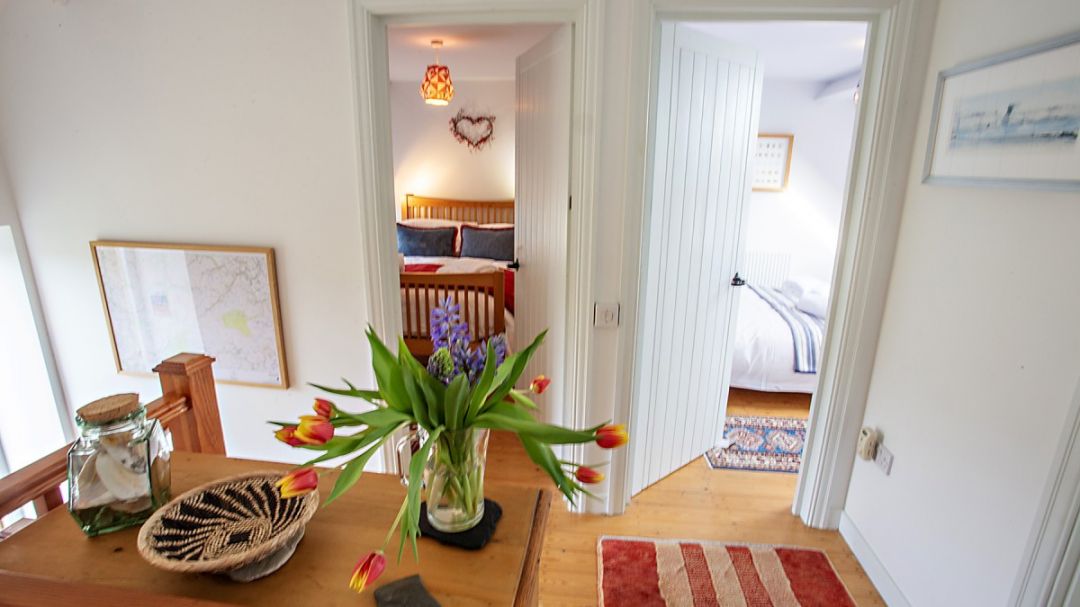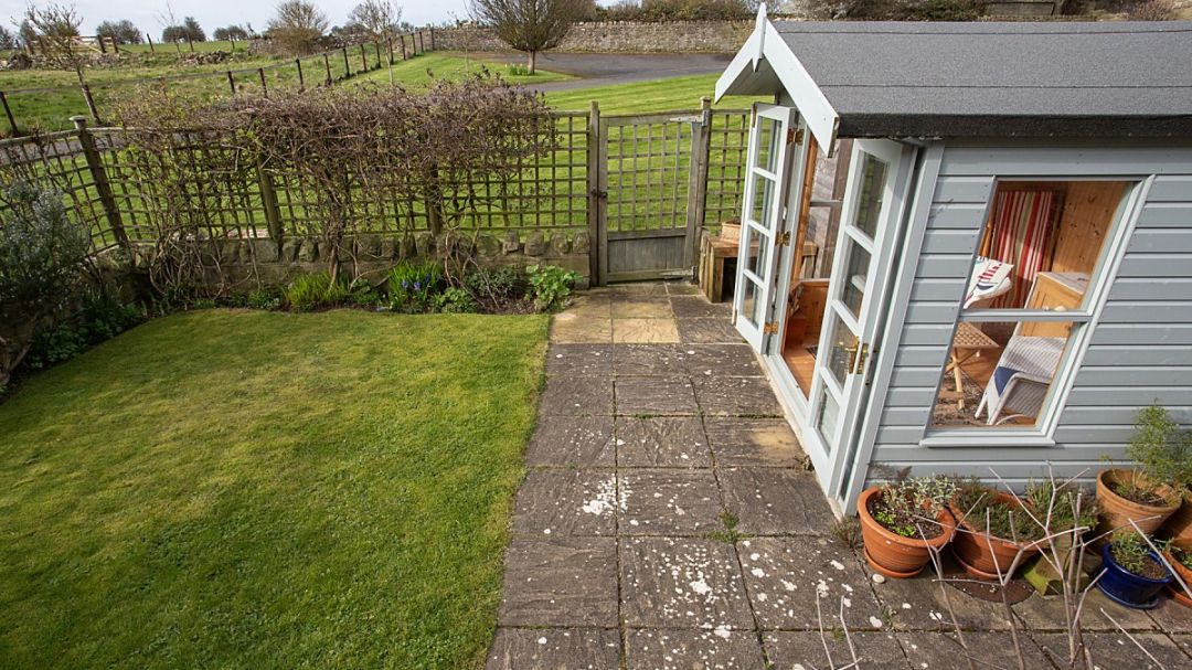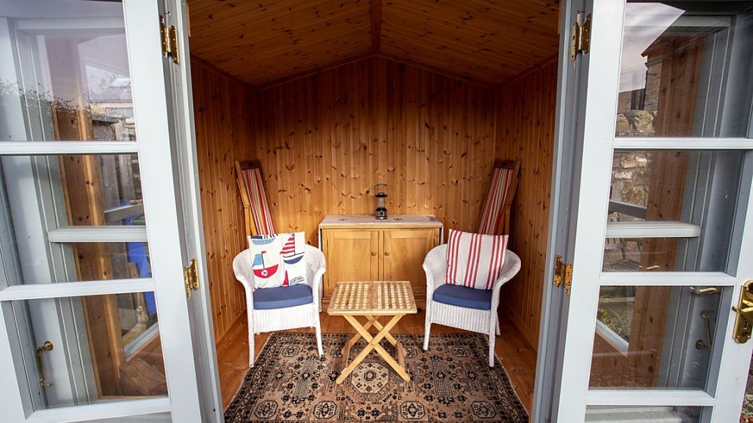 The front garden is a small enclosed space with a bench, looking out across the fields towards the sea. At the rear, the patio garden is accessed from the house or via the gate and features a summer house that serves as a sheltered spot on breezy days. There are two off-street parking spaces.