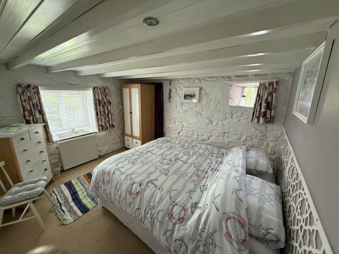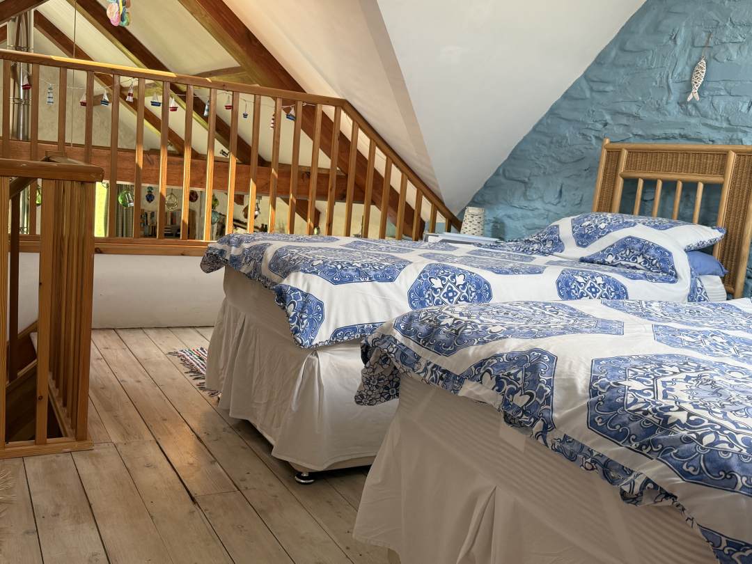Down two steps, you’ll find a bedroom with a king-size bed that can be arranged as two singles if preferred, along with a bathroom featuring bath, shower, basin and WC. Upstairs, the galleried crog loft offers a super king-size bed (which can also be split into two singles) plus a pull-out single bed—ideal for flexible sleeping arrangements.