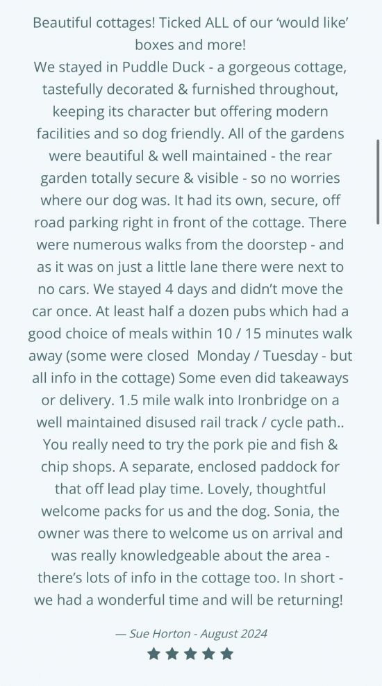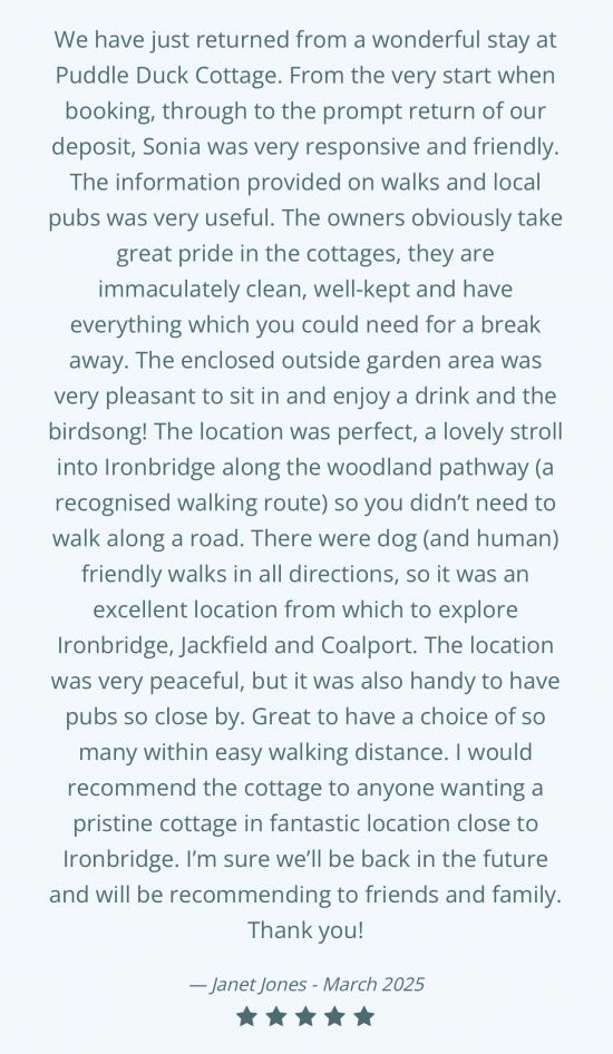 Puddle Duck Cottage is a beautifully presented 3-bedroom, 2 bathroom property in the heart of the Ironbridge Gorge, Shropshire with a contemporary interior, it is well appointed throughout and provides guests comfortable and flexible accommodation, with character features consisting of wooden beams, as well as a lovely large inglenook fireplace with log burner, all of which help to create a charming atmosphere and offers guests a truly home from home holiday experience. The property benefits from its own private drive with free parking and secure gardens and is in a tranquil and peaceful location next to the River Severn at Jackfield, with the Wrekin Way footpath accessed from the front door, providing our guests with direct access to traffic free scenic walks and cycle trails to enjoy. The perfect reason to leave your car parked up for the duration of your stay and explore everywhere on foot or bike if you so wish. You are spoilt for choice for places to enjoy a bite to eat and drink, whether that be fine dining at a local restaurant, coffee, and homemade cake at one of the cafés or the perfect pint with a pub lunch at the many local hostelries within a 5-minute walk.