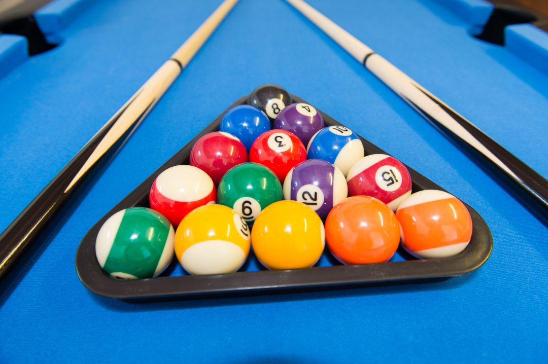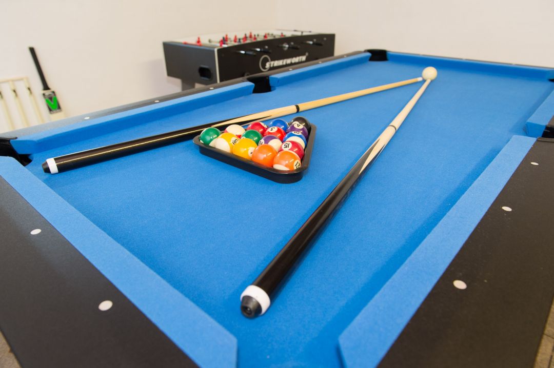 Outdoor gamesroom including a pool table, darts table, crazy football, giant connect 4 and secure bike storage.