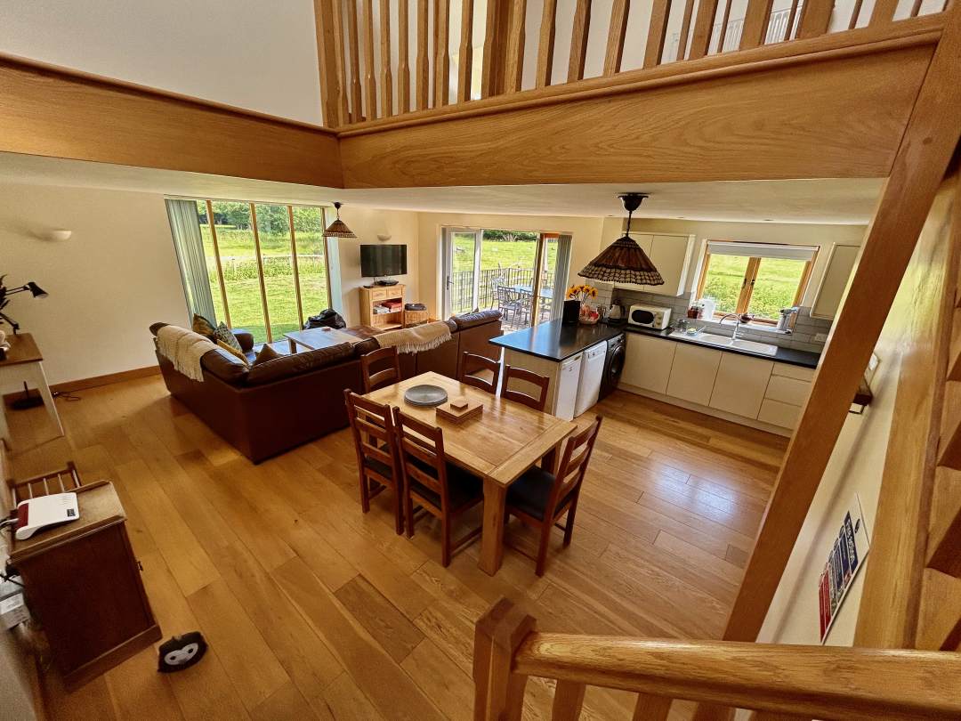 Leat Cottage has a spacious open-plan living area with large French doors and windows that let the outside flood in, and take you outside to a patio where many a lazy day can be spent relaxing alongside the river which can often attract visiting wildlife and birds.