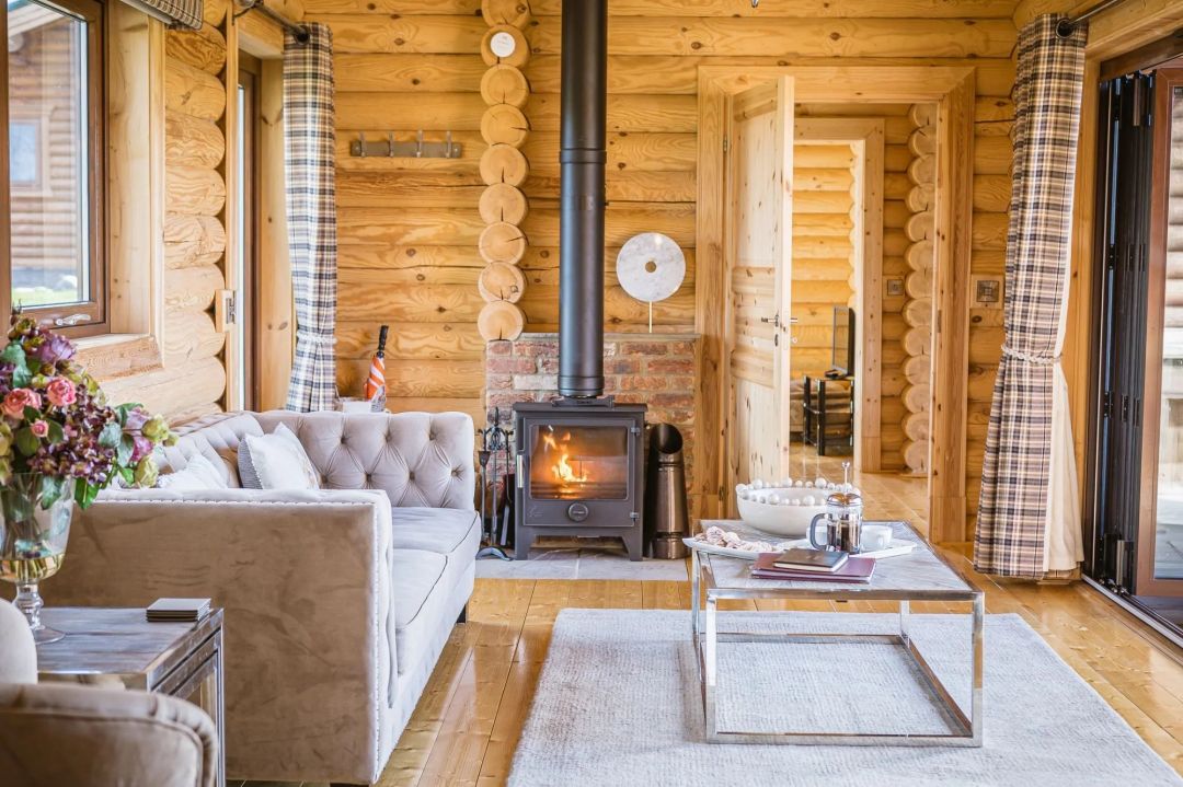 The open-plan living space is warm and inviting, featuring a log-burning stove, comfortable seating, and a Smart TV for cosy nights in. Bifold doors open directly onto the garden, filling the lodge with natural light and countryside views.