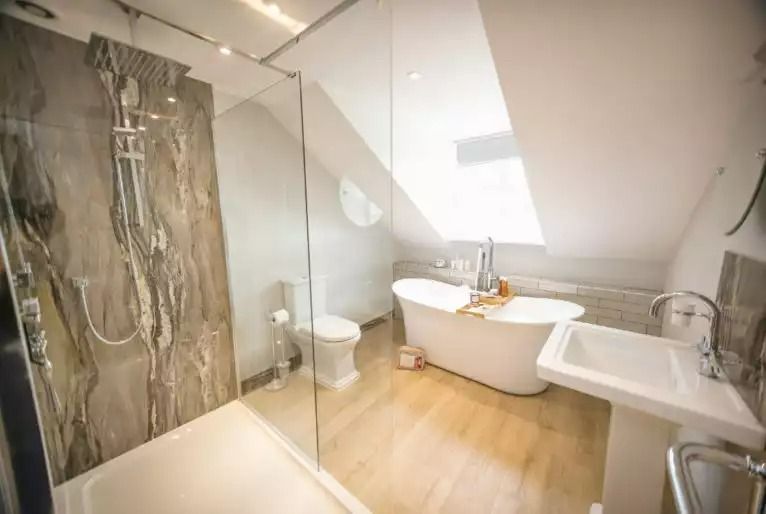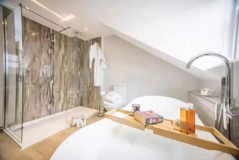 The modern bathroom has a large slipper bath, making an evening spent pure relaxation very tempting. Beyond the bath, the window offers views over Frenchgate and the Richmond hills beyond. There is a separate large walk-in rainfall shower to add to the luxuries.