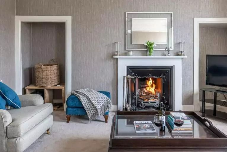 The impressive staircase leads up to the first-floor sitting room. Sumptuous sofas and chairs in front of the open fire make it all too tempting to pop on the TV for a lazy afternoon after a walk in the nearby Yorkshire Dales. There is plenty of space for everyone to come together, and the warm soft colour tones make for a peaceful retreat.